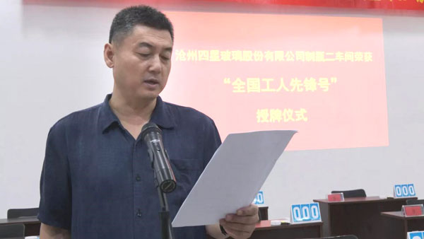 6月29日上午,滄縣總工會在滄州四星玻璃股份有限公司舉行“全國工人先鋒號”授牌儀式,為榮獲“全國工人先鋒號”的滄州四星玻璃股份有限公司制瓶二車間頒發(fā)表彰授牌,滄縣人大常委會副主任、總工會主席徐澤林,滄縣總工會黨組書記、常務副主席趙洪濤,中共滄縣縣委組織部副部長、兩新工委書記李金峰,滄州市總工會組織部副部長王超,紙房頭鎮(zhèn)黨委書記許勇,紙房頭鎮(zhèn)人大主席何玉利,紙房頭鎮(zhèn)人大副主席呂增煥,滄州四星玻璃股份有限公司董事長王煥一參加了授牌儀式。